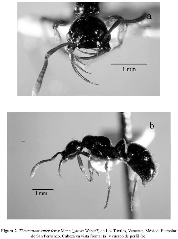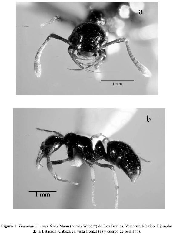 Límite norte del género. La distribución geográfica de ferox va desde México hasta la amazonia brasileña, mientras que la de atrox desde Panamá hasta el sureste de Brasil y Bolivia. La distribución de ambas especies se sobrelapa a la altura de Costa Rica y Panamá por lo que las colectas en esta región deberían ser prioritarias. La presencia de Thaumatomyrmex en México y particularmente en Los Tuxtlas es interesante desde el punto de vista biogeográfico, ya que lo ubica dentro del grupo de géneros de hormigas de origen sudamericano que alcanzan su límite norte de distribución en las tierras bajas y de mediana altitud del estado de Veracruz (Lattke 2003), siguiendo la distribución de las selvas húmedas en el continente. Es poco probable que este género se encuentre más al norte si se considera que solamente quedan pequeños parches muy perturbados de selva más allá del paralelo 18ºN, y que Los Tuxtlas ha sido establecido como el límite boreal actual de la selva húmeda tropical (Dirzo y Miranda 1991). Recientemente se incluyeron en la página de internet Ant Web (2008) registros de T. ferox provenientes del estado de Chiapas y de una especie no identificada del estado de Guerrero, ambas localidades ubicadas al sur de Los Tuxtlas.