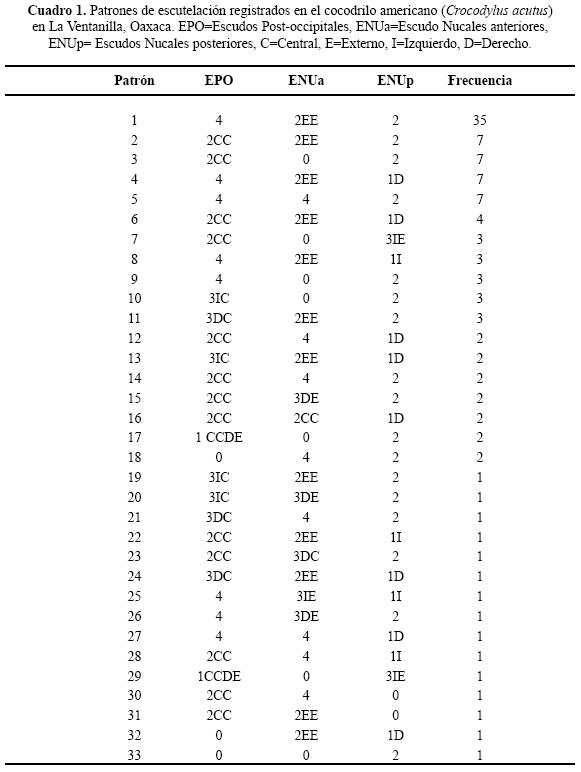 The postoccipital and nucal scutellation patterns of 111 crocodiles (Crocodylus acutus) from La Ventanilla, Oaxaca were analyzed. Thirty three different scutellation patterns were found. The most frequently observed pattern (31.5%) was 4 postoccipital scales present 2 external previous nucal scales absent, and 2 posterior nucal scales present (42EE2). The pattern considered typical for this species was observed only in 6.31% of individuals. There were differences between the frequency distribution of common patterns when compared to other studies on C. acutus.