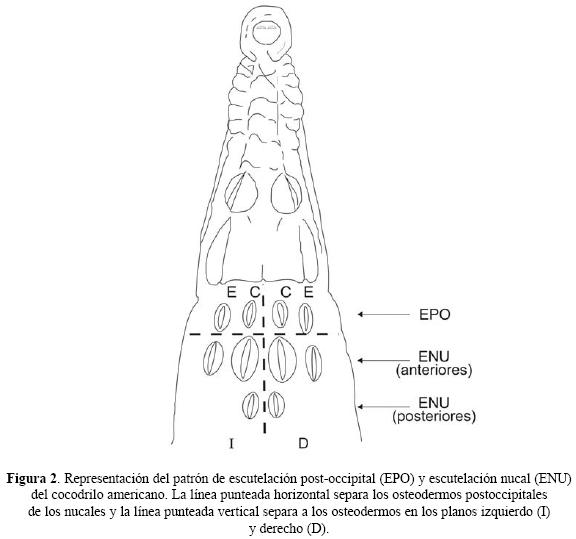 Se sabe que el cocodrilo americano es la especie que presenta más variaciones en cuanto al número y disposición de los osteodermos cervicales (EPO/ENU). Villegas (datos no publicados) menciona que la disposición de osteodermos cervicales (EPO/ENU) encontrados en los cocodrilos de Bahía de Chetumal es variable llegándose a encontrar desde dos postoccipitales hasta cuatro y de dos hasta ocho, no obstante en los patrones detectados en el presente estudio se registraron individuos con ausencia de postoccipitales y como mínimo dos nucales. Brazaitis (1973) menciona que registró algunos organismos con sólo un osteodermo en los nucales, sin embargo esta condición no fue encontrada en los organismos bajo estudio en el presente trabajo y tampoco en los organismos analizados por Seijas (2002) en Venezuela.