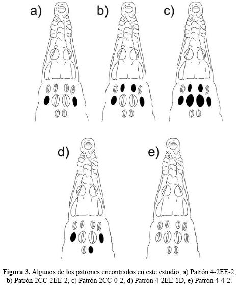 A la agrupación de cuatro escudos postoccipitales (EPO) y seis escudos nucales (ENU) distribuidos en dos líneas (cuatro ENU anteriores y dos ENU posteriores), se le consideró como el patrón típico para la especie (Brazaitis 1973, Garrick 1982, Seijas 2002). Se utilizó una nomenclatura específica para determinar las variaciones del patrón de escutelación y en el que se describe la cantidad de escudos presentes por línea en cada región (EPO/ENU), tomando lectura de izquierda a derecha y marcando el sitio y lado donde hubiese ausencia de escudos con respecto al patrón típico (Fig. 2).