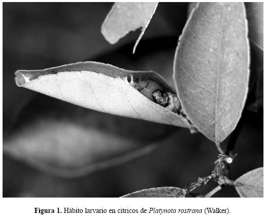 Las especies de la familia Tortricidae, son microlepidópteros de gran importancia económica conocidos como enrolladores de hoja e incluyen plagas presentes en una amplia variedad de cultivos agrícolas, hortícolas y forestales. Aún cuando tiene distribución cosmopolita, la familia está mejor representada en regiones templadas, tropicales y subtropicales (Meijerman y Ulenberg, 2000). En México, ha sido poco estudiada y se estima que pueden existir más de 1500 especies, en su mayoría no descritas (Morón y Terrón, 1988). Baker (s/a), menciona que Platynota sp. ha sido descrita como organismo polífago. De igual manera, Maes (2004) enlista 13 familias botánicas afectadas por Platynota rostrana en Nicaragua, donde enfatiza por su importancia económica a las rutáceas (Citrus), poáceas (Oryza), vitáceas (Vitis), lauráceas (Persea), fabáceas (Phaseolus), malváceas (Gossypium), maláceas (Malus), solanáceas (Capsicum) entre otras. En la República Dominicana, Abud (1981) encontró larvas que perforaban los frutos de limón agrio (Citrus aurantifolia var. mexicana) y posteriormente encontró larvas que ocasionaban daño en hojas y frutos de naranja (Citrus sinensis), obtuvo adultos de Platynota rostrana. En años recientes, ha sido detectada en cítricos en el periodo inmediato a la floración, en algunas regiones de São Paulo en Brasil, larvas dañando frutos inmaduros y hojas (Nava et al., 2006). Kerns et al. (s/a), señalan que los enrolladores de hoja son plagas frecuentes en viveros de cítricos en Arizona, EU, cuando las poblaciones ocurren en árboles maduros causan estrés y caída del fruto, mientras que el daño en árboles jóvenes puede retardar el desarrollo. La familia incluye palomillas pequeñas de color café opaco o amarillo, la característica más sobresaliente es el hábito larvario de formar un refugio y alimentarse dentro de él. Los enrolladores de las hojas producen seda que utilizan para unir las hojas entre sí o unir las hojas con la fruta en donde se resguardan y alimentan (Nava et al. 2006) (Fig. 1). La larva posee fuertes mandíbulas que le permiten morder los tejidos vegetales, se alimenta de la superficie de la fruta, y puede cubrir un área grande, ocasionar un sólo orificio pequeño superficial o cavar galerías en los frutos para su alimentación (Simone 2004).