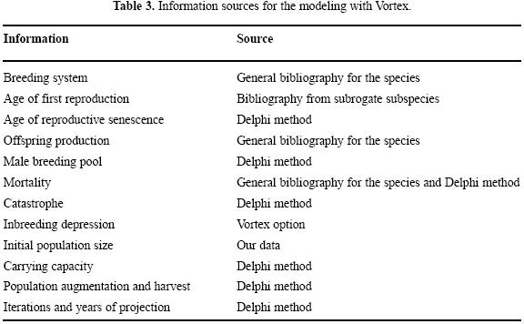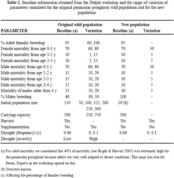 Population Viability Analysis (PVA) has been developed to assess extinction risk and to compare management options. PVA is a methodology for predicting the future fate of wildlife populations based on demographic, environmental and genetic parameters, most commonly with the use of computer simulation (Brook et al. 1999). A Population Viability Analysis requires information on the demography, ecology and habitat requirements of a species (Beissinger & McCullough 2002; Miller & Lacy 2003). More accurate information on these parameters will permit researchers to more realistically simulate alternative future population scenarios (Durant & Mace 1994; Brook et al. 2000; Ellner et al. 2002). Most information on the peninsular pronghorn ecology and biology is known from several studies in the area (Cancino et al. 1995; Cancino 2003; Cancino et al. 2005). However, in cases where data were absent we used the abundant literature on the biology and ecology of the pronghorn species (O'Gara 1978; Lee et al. 1998; O'Gara & Yoakum 2004). In particular, we used particular useful data from surrogate subspecies present in similar habitat (Hosack et al. 2002; Bright & Hervert 2005). We also convened a meeting of pronghorn experts from USA and Mexico to use a Delphi method to determine some values of the variables required (Table 2). The meeting was done on April, 2004 at La Paz, Baja California Sur, Mexico. Three main sets of analyses were performed to: a) Assess the probability of survival for the wild source population in the Biosphere Reserve; b) Assess the probability of survival for the wild source population given the "harvest" of 16 fawns and six wild adults to establish a captive herd; and c) Evaluate the likelihood of successfully establishing a new wild population derived from the captive herd under different management possibilities.