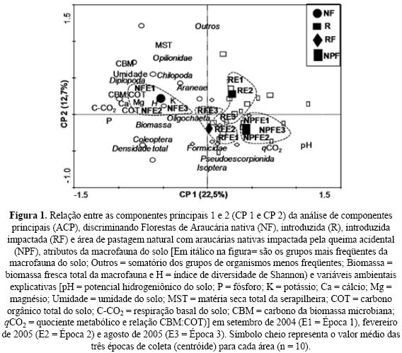 O estudo da macrofauna do solo em áreas com Araucaria angustifolia é importante para entender os processos edáficos que ocorrem nestes ecossistemas, já que esses animais atuam na decomposição e mineralização da matéria orgânica e na manutenção da estrutura do solo. O presente estudo teve o objetivo de avaliar, em áreas com araucária naturais e reflorestadas, impactadas ou não pela queima acidental, o potencial indicador da macrofauna edáfica e de variáveis ambientais (químicas e microbiológicas do solo) para separar as áreas, por meio da análise canónica discriminante (ACD). As áreas estudadas incluíram: floresta nativa com araucária, reflorestamento de araucária, reflorestamento de araucária submetido a incêndio acidental, e campo nativo com araucárias nativas e ocorrência de incêndio. Em cada área, dez amostras de solo foram coletadas, próximo a dez árvores de araucária selecionadas ao acaso, em três épocas contrastantes, usando o método de escavação e triagem manual de monólitos (TSBF). Observouse um impacto importante da intervenção antrópica sobre os atributos biológicos e químicos do solo. A macrofauna edáfica apresentou potencial para ser usada como indicadora da qualidade do solo. Os grupos Diplopoda, Chilopoda, Isoptera e Araneae, e biomassa da macrofauna, índice de diversidade de Shannon (H), matéria seca total da serapilheira, fósforo e atributos microbiológicos, especialmente carbono da biomassa microbiana e respiração basal foram os responsáveis por praticamente toda a separação entre as áreas, sendo bons indicadores das modificações que ocorreram nos ecossistemas. A contribuição de cada atributo para separar as vieras teve efeito da sazonalidade.