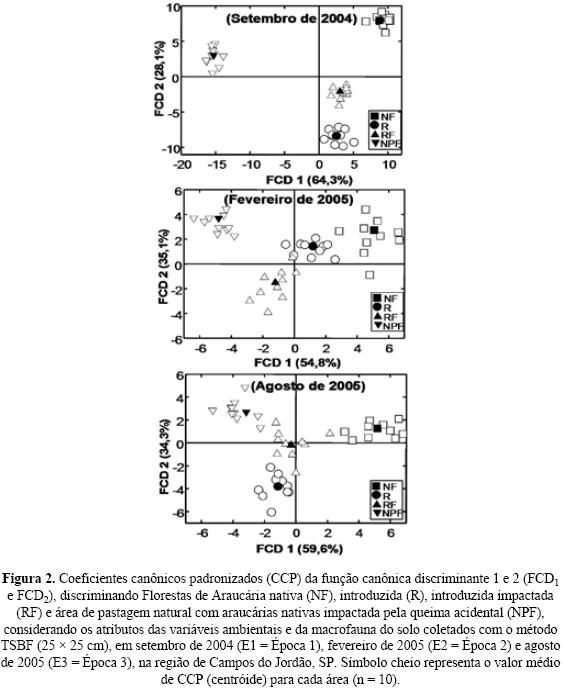 Na Fig. 2, estão indicados os coeficientes canónicos padronizados (CCP) da FCD1 e FCD2, para as quatro áreas com araucária amostradas, considerando todos os atributos ambientais e da macrofauna analisados em cada época de amostragem. O CCP explica o comportamento multivariado dos diferentes atributos para promover a separação entre as áreas com araucária, em resposta ao estudo das variáveis independentes, analisadas simultaneamente (Hair et al. 1987, CruzCastillo et al. 1994, Baretta et al. 2006).