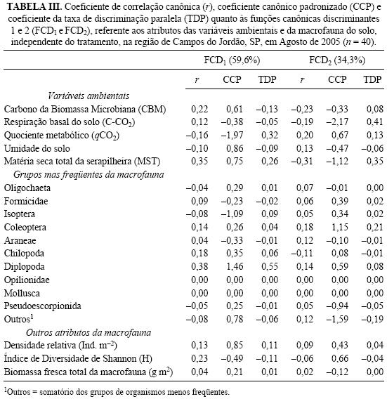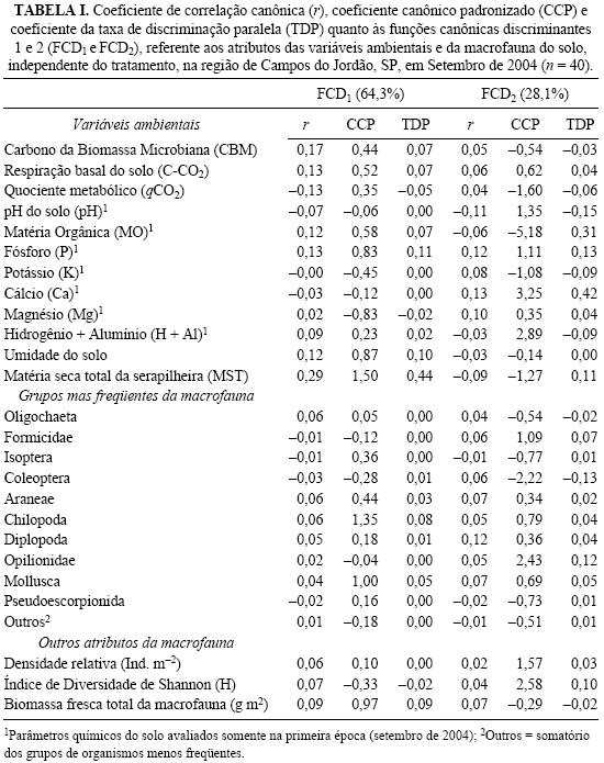 Na amostragem de agosto (2005), dentro da FCD1, os atributos qCO2 (0,32) e MST (0,26), e na FCD2, os atributos CCO2 (0,41) e MST (0,35), apresentaram os maiores valores positivos de coeficientes TDP (Tabela III). Os atributos da macrofauna com maiores valores de TDP na FCD1 foram os grupos Diplopoda (0,55), Isoptera (0,09) e a densidade relativa da macrofauna (0,11), enquanto na FCD2, foram os grupos Coleoptera (0,21) e Diplopoda (0,08).
