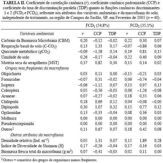 Na amostragem de fevereiro (2005), dentro da FCD1, os atributos MST (0,30), CCO2 (0,17) e qCO2 (0,14) apresentaram os maiores valores positivos de coeficientes TDP (Tabela II). Os atributos da macrofauna que apresentaram maiores valores de TDP na FCD1 foram os grupos Diplopoda (0,32), Chilopoda (0,12), Isoptera (0,07) e a densidade relativa da macrofauna (0,07). Na FCD2, os atributos qCO2 (0,15), umidade do solo (0,09) e CBM (0,07) apresentaram os maiores valores positivos de coeficientes TDP. Os atributos da macrofauna que apresentaram maiores valores de TDP na FCD2 foram densidade relativa da macrofauna (0,28) e os grupos Isoptera (0,13), Diplopoda (0,12) e Outros (0,08). Portanto, em fevereiro (2005) de todos os atributos das variáveis ambientais e da macrofauna estudados, o grupo Diplopoda foi o que contribuiu mais para a separação entre as áreas, sendo um bom indicador das interferências antrópicas.