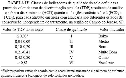 A aplicação do TDP permitiu obter um valor indicador para os atributos estudados. A partir desses resultados de TDP da análise ACD propõese a separação dos indicadores em seis classes, de acordo com seu valor de indicador (Tabela IV). Isso pode auxiliar na escolha dos atributos do solo que são mais sensíveis para promover diferenças entre os tratamentos, e evitar a perda de tempo e dinheiro com variáveis edáficas que não respondem aos efeitos testados.