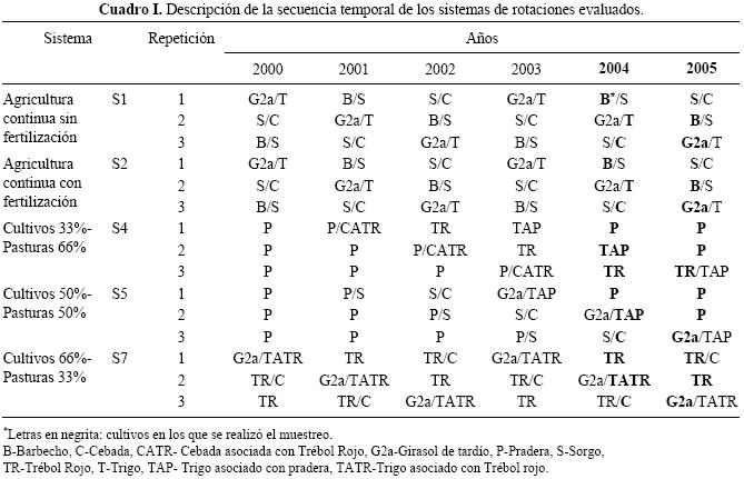 Los tratamientos evaluados fueron: S1 agricultura continua sin fertilización (sorgo cebada girasol 2a trigo); S2 agricultura continua con fertilización (secuencia idéntica a S1); S4 agricultura (trigo y cebada) en rotación con pasturas de leguminosas y gramíneas, con 33% del tiempo en cultivos y 66% con trébol rojo y pradera mezcla de leguminosas y gramíneas; S5 agricultura (sorgo, cebada, girasol 2a, trigo) en rotación con pasturas mezcla de leguminosas y gramíneas, con 50% del tiempo en cultivos y la otra mitad con pradera mezcla de leguminosas y gramíneas; y S7 agricultura (cebada, girasol 2a, trigo) en rotación con trébol rojo, con 66% del tiempo en cultivos y el resto con pasturas (Cuadro I).