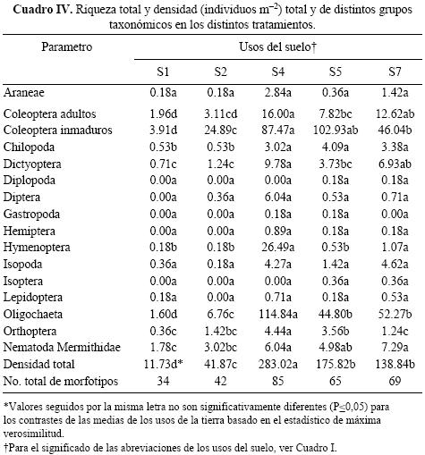La riqueza y la densidad total de individuos y de los grupos taxonómicos en los que hubo efecto del tratamiento cambiaron según la frecuencia del disturbio físico y las diferencias en la vegetación. Los tratamientos que consideran leguminosas forrajeras en la rotación favorecieron la presencia de la macrofauna del suelo. La rotación S4 fue la que registró los valores más altos, señalando que este uso del suelo brindó las condiciones de hábitat más favorables, con mayor número de recursos a ser colonizados (Azevedo et al. 2000, Decáens et al. 2001).