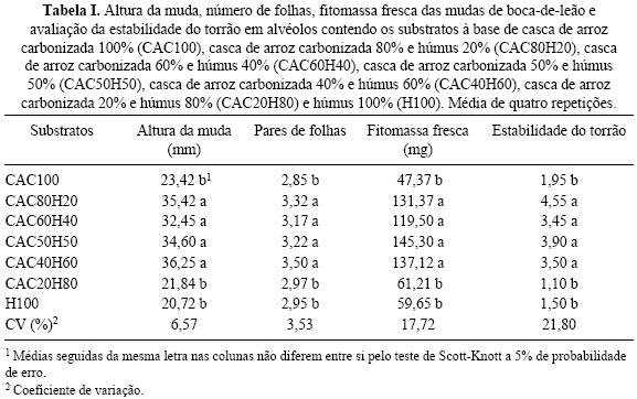 Os tratamentos constituídos por CAC40H60, CAC50H50, CAC60H40 e CAC80H20 produziram mudas de bocadeleão com melhor qualidade, quando comparados aos demais substratos avaliados. Embora estes tratamentos não tenham apresentado diferenças estatísticas, os valores médios de altura da planta, número de pares de folhas e fitomassa tenderam a ser maiores no tratamento constituído pela proporção 40% casca de arroz carbonizada e 60% húmus (Tabela I).