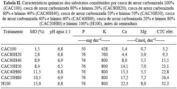 Em relação aos parâmetros químicos analisados nos substratos, observouse um aumento no teor de matéria orgânica, cálcio, magnésio e CTC efetiva à medida que se elevou a proporção de húmus adicionado à casca de arroz (Tabela II). Os valores de pH dos substratos (6,5 a 6,9) utilizados neste estudo foram mais elevados do que os considerados ideais para o desenvolvimento da maioria das plantas em recipientes.