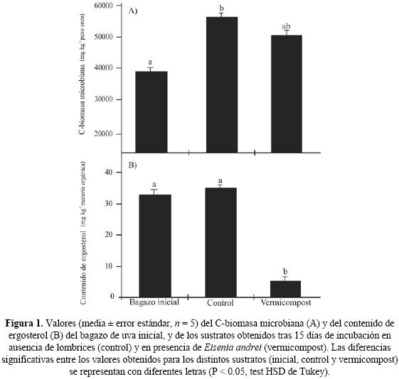 The wine industry, of particular importance in various regions of Spain, generates vast amounts of organic waste during the different stages of wine production. Among the possible methodological alternatives available for its treatment, vermicomposting is one of the bestknown processes for the biological stabilization of solid organic wastes by transforming them into safer and more stabilized materials suitable for application to soil. In this study we analyzed the chemical, biochemical and microbiological changes that occur in the first stages of the degradation of grape marc, an organic residue whose accumulation and management constitute an important environmental problem. After fifteen days of vermicomposting, a significant reduction in the fungal biomass measured as the ergosterol content was observed, as well as a reduction in microbial activity and cellulase and protease activities. The speed at which these transformations occurred makes vermicomposting a good system for studying the role of earthworms and their associated microflora in the first stages of grape marc degradation, providing important advances in the possible application of vermicomposting as an alternative for the treatment of organic residues derived from the wine industry.
