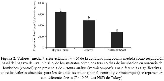 La actividad microbiana medida como respiración basal fue 6326 mg CO2 kg1 materia orgánica en el bagazo inicial. Tras 15 días de incubación se observó un cambio significativo en este parámetro (Fig. 2, ANOVA F212 = 110,672; P = 0.001); la actividad microbiana del bagazo se redujo considerablemente en el sustrato control (4842 mg CO2 kg1), aunque ésta fue mucho más baja tras el vermicompostaje (2795 mg CO2 kg1).