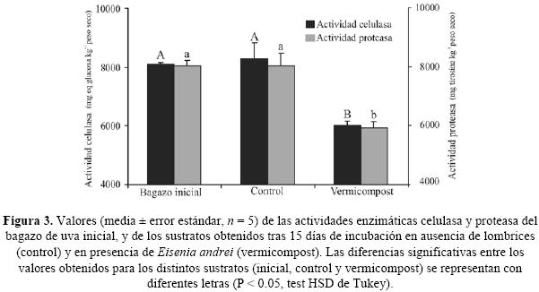 La actividad celulasa del bagazo inicial fue 8220 mg eq glucosa g1 peso seco, y varió de forma significativa tras 15 días de incubación (Fig. 3, ANOVA F2,12 = 10,158; P = 0,003). La actividad de este enzima aumentó ligeramente en el sustrato control y alcanzó un valor de 8550 mg eq glucosa g1 peso seco; tras el vermicompostaje se detectó, sin embargo, una actividad mucho menor (5850 mg eq glucosa g1), de forma que el vermicompost fue significativamente diferente en cuanto a su actividad celulasa del bagazo inicial y del sustrato control (Fig. 3). El bagazo inicial presentó una actividad proteasa de 8108 mg tirosina kg1 peso seco. Tras 15 días de incubación se observaron los mismos fenómenos observados para a actividad de la celulasa, con valores significativamente menores tras el vermicompostaje y sin diferencias significativas entre el bagazo inicial y el sustrato control (Fig. 3).