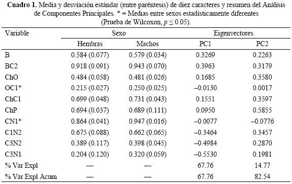 Las comparaciones univariadas mostraron diferencias significativas en los valores de las medidas 3 y 7, que son medidas que tienen como referencia el centro del ojo; en ambas variables los machos tienen valores promedio más altos que las hembras (Cuadro 1). En el contexto multivariado, los dos primeros Componentes Principales explicaron el 82.5% de la varianza total de la muestra, con los machos mostrando muy poca variación en el Componente Principal 1 y valores extremos en el 2; no fue posible distinguir con certeza entre machos y hembras (Fig. 2). Las medidas que presentan cierta relevancia en el Componente Principal 1, son la 1, 2, 10 y 11 (Cuadro 1; Fig. 2). Las primeras dos variables tienen que ver con el tamaño y aparentemente con la forma del pico y su relación con la cabeza; por su parte, las otras dos variables tienen que ver con la forma del parche facial y la posición del ojo en el mismo. En el componente principal 2, las características relevantes fueron las 3, 6, 7 y 8 (Cuadro 1; Fig. 2). Estas variables tienen que ver con la posición del ojo y con la forma del parche facial. De esta forma, tanto la prueba de Wilcoxon como el Análisis de Componentes Principales sugirieron a la posición del ojo y la forma del parche facial como características importantes en el dimorfismo sexual de esta especie.