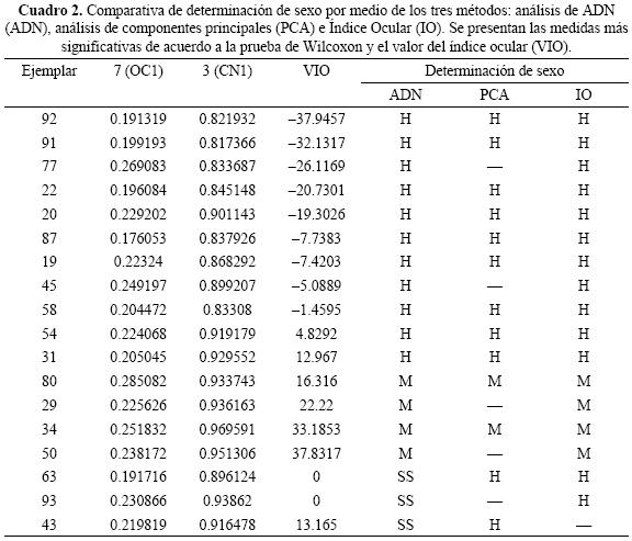 La distinción entre sexos de los ejemplares por medio del Índice Ocular es mucho más simple y clara. Esta variable representa un método que define claramente en la mayoría de los casos el sexo de los individuos. Una combinación de ambos análisis (PCA e IO) podría resolver un porcentaje próximo al 100% de los casos y convertirse en un método no invasivo de determinación del sexo en Ara militaris, sin riesgos y mucho más económico que los empleados actualmente (Cuadro 2). Es importante aclarar el valor de esta herramienta para estudios de campo y manejo de poblaciones silvestres. Se propone que se revise la utilidad de este índice para otras especies de Psitacidae. Para el manejo de ejemplares en cautividad, donde la certidumbre en la determinación del sexo es vital para los programas de reproducción, probablemente sea mejor usar el método de determinación del sexo por ADN, pues su mayor certeza compensa el mayor costo del análisis.