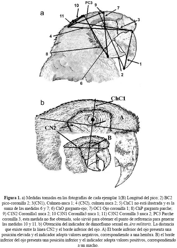 Con fundamento en experiencias previas (Bonilla et al. 2007a, 2007b, Martínez & Bonilla 2008) y teniendo como hipótesis que algunas de las diferencias sexuales morfológicas se encuentran en la forma de la cabeza y en el tamaño y disposición de las diferentes estructuras observables en su perfil, se propone obtener un total de 11 medidas lineales a partir de fotografías de perfil de la cabeza de cada ejemplar; tres de ellas fueron determinadas a partir de dos líneas imaginarias pero identificables y trazables (Fig. 1a). El trabajar con fotografías probó ser un método eficaz, sin generar problemas para la medición de las medidas lineales de la cabeza. El tomar estas medidas sobre el animal vivo implicaría un manejo que estresa al animal y que hace muy complicado que la toma de las medidas sea estandarizada, con lo que se provocarían sesgos mayores que con las fotografías, que son fijas. Las fotografías han de tomarse de perfil, en un plano lo más transversal posible con respecto al plano de la cara. Debe apreciarse claramente el ojo, el pico y el perfil de la cabeza completa, así como el parche facial sin plumas (Fig. 1). De preferencia no debe utilizarse la foto si ésta fue tomada durante alguna vocalización que implique un movimiento significativo del pico.