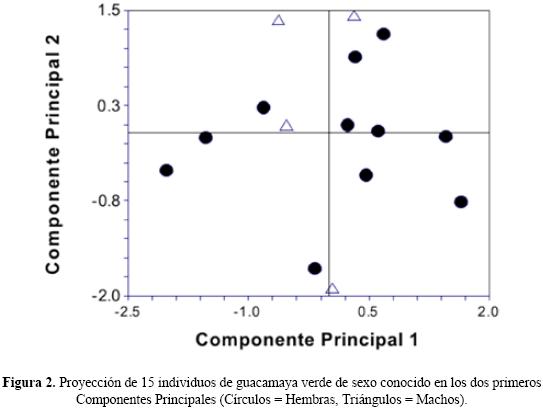Para evaluar la variación en cada una de las variables de acuerdo al sexo, se utilizaron los datos de los ejemplares con sexo conocido. Dado el tamaño muestral pequeño y desigual (cuatro machos y once hembras) se utilizó la prueba no paramétrica de Wilcoxon, considerando una significancia menor o igual a 0.05. Se eligió ésta prueba porque no supone una distribución de tipo normal de los valores, que sería muy difícil de observar particularmente en los valores de los machos por la muestra tan pequeña. Para explorar las diferencias entre variables de los grupos se realizó un Análisis de Componentes Principales a partir de una matriz de varianzacovarianza. Dado que los datos están expresados como proporciones de la medida 4, la magnitud es similar, por lo que no se estandarizaron. El análisis estadístico se llevó a cabo utilizando el programa NCSS 2004 (Hintze 2004). Aunque otros métodos como el de Funciones Discriminantes parecen ser una mejor opción para maximizar las diferencias entre sexos, requieren de un tamaño de muestra mayor del que se disponía para este estudio, dado que es necesario usar solo una parte de los datos para generar las funciones discriminantes (entre el 25 y el 30% de los datos) y el resto para validarla (Huberty & Olejnik 2006). El tipo de enfoque que usamos en el análisis permite probar de forma independiente la concordancia entre el resultado de la determinación del sexo a partir del ADN y las características morfométricas.