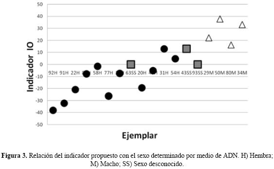 Al tomar como referencia a los tres ejemplares cuyo sexo era desconocido, dos fueron identificados como hembras (IO = 0 en ambos casos); el tercero (IO = 13.165) no pudo ser definido claramente por este medio (Fig. 3). Sin embargo, al observar los valores para la medidas 3 y 6 de este individuo (0.929 y 0.205, respectivamente), éstas quedan incluidas principalmente dentro de las esperadas para las hembras, por lo que tentativamente estos ejemplares pueden ser considerados como miembros de este sexo, hasta que estudios moleculares o comportamentales lo comprueben.