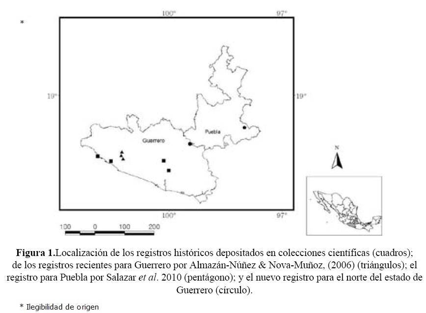Por otro lado, Urbina-Torres y colaboradores (2009), citan reportes (A. Sandoval com. per.) de la especie en la localidad de Papalutla al norte de Guerrero, sin embargo, hasta el momento no se había confirmado la presencia de la especie en la zona. En este trabajo documentamos por primera vez la presencia de al menos 30 individuos que posiblemente están utilizando como dormidero el cañón de Chichuehuetlán, cercano a la localidad de Papalutla, Guerrero. Los registros aquí presentados se ubican a 220 kilómetros al NE de los registros más recientes en el estado de Guerrero (Almazán-Núñez & Nova-Muñoz, 2006) y a 180 km al SO de los registros recientemente publicados por Salazar et al.(2010), en el estado de Puebla (Fig. 1).