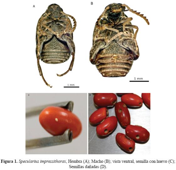 Specularius impressithorax se reportó por primera vez en México en 2009 (Romero et al. 2009). De acuerdo con Kingsolver & Decelle (1979) Specularius (Bridwell) es un género de Bruchidae del Viejo Mundo que incluye ocho especies, una de ellas con dos subespecies. La especie más importante en el género es Specularius impressithorax (Pic), con una amplia distribución presentando polifagia, ya que se alimenta de por lo menos 13 especies de Erythrina (Romero 2011). Las otras especies de Specularius se alimentan de otros géneros de leguminosas. El género Erythrina es una leguminosa con distribución principalmente en las zonas tropicales del mundo. Krukoff & Barnaby (1974) revisaron el género y reconocieron 105 especies; posteriormente, Gunn & Barnes (1977) describieron las semillas con técnicas morfométricas de 101 especies. Neil (1988) estudió las relaciones biosistemáticas de las especies y reconoció 112 especies. Por otro lado, Barrera et al. (2002) mencionaron que Erythrina incluía 117 especies. La mayoría de ellas son plantas ornamentales, aunque algunas se usan como alimento en Sudamérica, tal es el caso de Erythrina edulis Micheli. Según Pino et al. (2004) los países donde se ha reportado el uso etnomédico de especies de Erythrina con mayor intensidad son México e India. En programas agroalimentarios las semillas se transforman en harinas con alto contenido de proteína.
