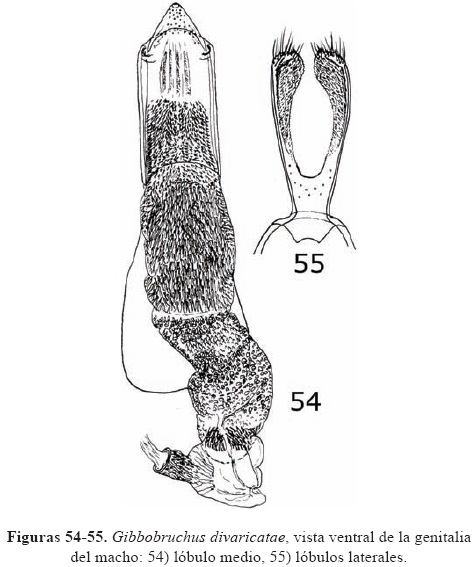 Discusión. A. difficilis y A. mimosicola son especies similares; sin embargo, a A. difficilis se puede separar fácilmente debido a que los ojos son 1.4 veces el ancho de la frente, el escutelo es cuadrado y las antenas alcanzan 0.25 la longitud de los élitros, también los escleritos del saco interno de la genitalia del macho son muy característicos.