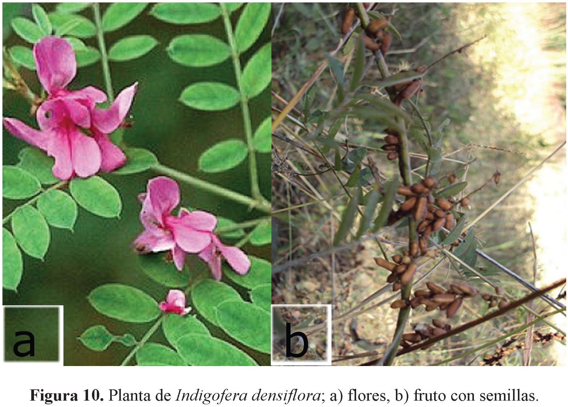 El género Indigofera está formado por 700 especies tropicales y subtropicales, repartidas en todo el mundo, especialmente en África (Gepts et al. 2005). Indigofera densiflora M. Martens & Galeotti (Fabaceae: Fabales) es un arbusto de unos 2 m de altura, cuyas hojas miden 10-15 cm, están formadas de 13-23 foliolos oblongos y mucronados, con la cara superior lisa o escasamente pilosa y la cubierta inferior de pelillos blanquizcos; racimos de 5-28 cm de largo, con las flores purpúreas pequeñas de 5 mm; legumbres oblongas de 6-8 mm (Sánchez 1969).