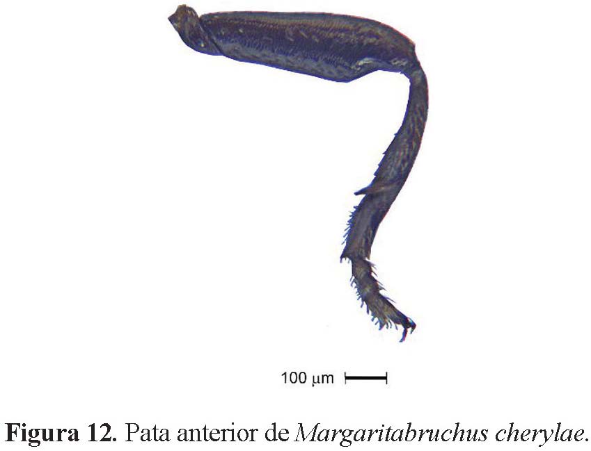Finalmente es importante indicar que en la descripción de la especie M. cherylae realizada por Romero & Johnson (2001), ellos nunca notaron la presencia de una espina preapical en la tibia anterior, por tal razón se ilustra ésta en la Figura 11 y Figura 12; esta estructura es muy importante debido a que es un carácter muy peculiar en el grupo, este tipo de espina sólo se ha registrado en especies del género Dahlibruchus tal y como lo describe Romero & Romero (2011).