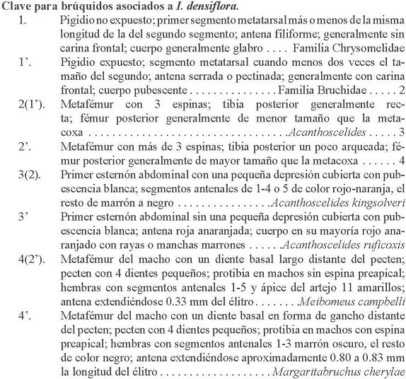 Insectos asociados a semillas de I. densiflora. Después de la revisión de colecciones y de colectas directas, se registraron cuatro especies de brúquidos que se alimentaron de las semillas de esta planta, Acanthoscelides kingsolveri Johnson, A. ruficoxis (Sharp), Margaritabruchus cherylae Romero & Johnson y Meibomeus campbelli (Kingsolver & Whitehead). A continuación se presenta una clave para facilitar su identificación y posteriormente se brinda información para cada especie en relación a su morfología, distribución, hospederos alternantes y alguna otra información de interés. Las plantas y estados de la República Mexicana con asterisco indican que son nuevos registros.