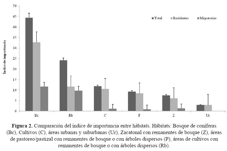 Se registraron un total de 129 especies (Anexo 1). De éstas, 90 corresponden a especies residentes, 31 a especies migratorias de invierno, siete a especies transitorias y una especie ocasional. El bosque de coníferas fue el hábitat que presentó los valores más altos de riqueza (68 especies), seguido de las áreas de cultivo (48 especies) y las áreas de cultivo con remanentes de bosque o con árboles dispersos (38 especies). De igual forma, el bosque de coníferas presentó los valores más altos de riqueza y diversidad tanto en la época seca (44 especies, H'=3.22, E'=0.97, λ=0.049) como en lluvias (32 especies, H'=3.10, E'=0.93, λ=0.040; Cuadro 1). Sin embargo, no se encontraron diferencias significativas entre los valores de riqueza y diversidad entre épocas del año (P>0.05; Cuadro 1). Mientras, que al comparar la diversidad entre hábitats sólo se encontraron diferencias significativas entre el bosque de coníferas con respecto a cultivos (t1998 (2)=13.88,P<0.05), áreas urbanas y suburbanas (t1554 (2)=6.74,P<0.05), zacatonal con remanentes de bosque (t1502 (2)=5.70, P<0.05) y áreas de pastoreo/pastizal con remanentes de bosque o con árboles dispersos (t1536 (2)=6.37, P<0.05). Del total de especies registradas en el bosque de coníferas (68 especies), 32 fueron especies exclusivas al bosque, seguido de las áreas de cultivo con 11 especies exclusivas y las áreas de cultivo con remanentes de bosque o con árboles dispersos con cuatro especies exclusivas. El índice de importancia del bosque de coníferas (Ij=44.38) fue mayor que en las áreas de cultivos con remanentes de bosque o con árboles dispersos (Ij=24.15) y zacatonal con remanentes de bosque (Ij=7.55) (Fig. 3), por contener una mayor abundancia de especies consideradas relativamente vulnerables a la perturbación (Stotz et al. 1996, Petit & Petit 2003). Estas diferencias fueron significativas entre el bosque y los otros hábitats considerando todas las especies tanto residentes como migratorias (ANOVA P<0.05), con excepción de los cultivos con remanentes de bosque o con árboles dispersos (P>0.05; Fig. 3). Mientras que las áreas urbanas/ suburbanas y las áreas de pastoreo/pastizal con remanentes de bosque o con árboles dispersos presentaron valores de importancia bajos.