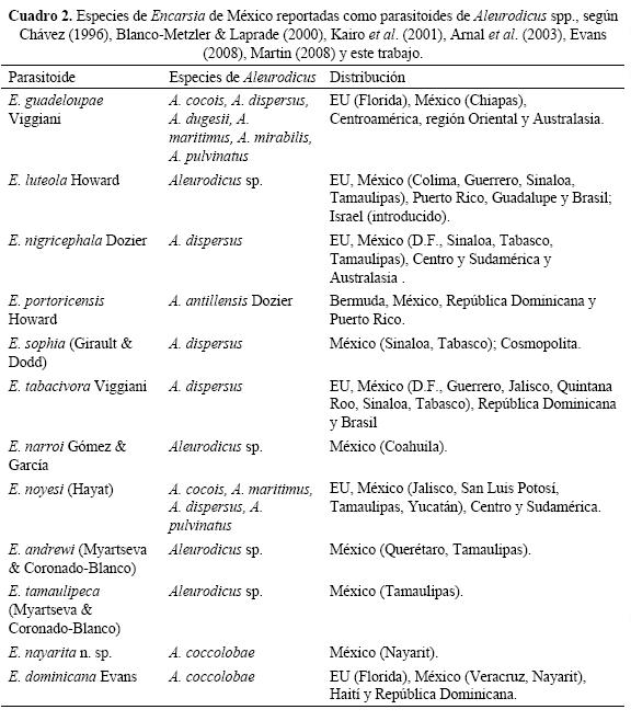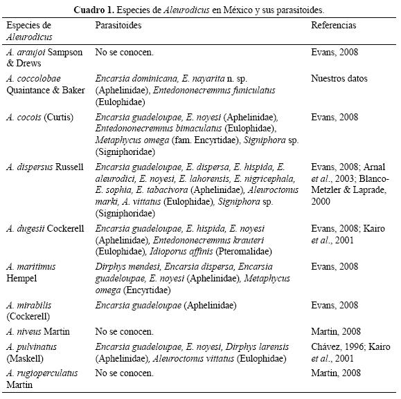 Parasitoides de Aleurodicus en México. De las 10 especies de Aleurodicus presentes en México, se conocen parasitoides para siete especies, la mayoría del género Encarsia; en el Cuadro 1 se enlistan las especies de Aleurodicus que ocurren en la República Mexicana y sus parasitoides registrados en la literatura, además de los obtenidos por los autores de este trabajo.