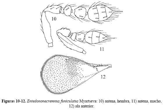 Diagnosis (Figs. 10-12). Hembra. Frontovértice cerca de 0.4 veces tan largo como la anchura de la cabeza. Escapo antenal 4 veces tan largo como ancho. Pedicelo 2 veces tan largo como ancho y 0.5 veces tan largo como el escapo (Fig. 10). Anelo fuertemente transversal. Segmento funicular 1 transversal, segmento 2 es 1.5 veces tan largo como el segmento 1 y de 1.1-1.4 veces tan ancho como largo; maza antenal con espina apical cerca de 0.4 veces tan larga como la maza. Mesosoma con escultura reticulada fuerte; mesoescudo y escutelo con 2-3 pares de setas. Espuela de la tibia media es setosa, ligeramente más larga que el basitarso. Ala anterior (Fig. 12) las venas postmarginal y estigmal cortas. Terguito basal del gáster pulido, los demás terguitos con escultura fina transversal-reticulada. Ovipositor 1.8 veces tan largo como la tibia media. Cabeza negra con brillo metálico, antenas amarillas. Mesosoma negro.