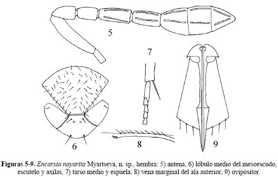 Comentarios. Encarsia nayarita n. sp. es cercana a E. noyesi (Hayat), de la que puede ser distinguida fácilmente por los siguientes caracteres: segmento funicular 2 negro desde el tercio superior hasta la mitad, ápice del segmento 3 ligeramente ahumado; ala anterior uniformemente setosa; sensilas escutelares placoideas separadas por una distancia de 2 a 3 veces el diámetro de una sensila; espuela de la tibia media más larga que el basitarso; válvula 3 es 0.7 veces tan larga como el valvífero 2; escapo y pedicelo antenales negros dorsalmente; segmento 3 de la maza antenal truncado oblicuamente. Por su parte, en E. noyesi los segmentos funiculares 2 y 3 son amarillos; ala anterior con una banda larga desnuda a lo largo del margen anterior; sensilas escutelares placoideas separadas por una distancia de 6 a 7 veces el diámetro de una sensila; espuela de la tibia media 0.9 tan larga como el basitarso; válvula 3 es 0.6 veces tan larga como el valvífero 2; escapo antenal blanco, pedicelo parduzco; segmentos 2 y 3 de la maza antenal truncados oblicuamente.