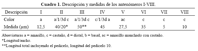 Antenómeros. Bien desarrollados, el antenómero I es corto y de color claro, el II es más largo y estilizado, pedicelo del antenómero III corto pero con un anillo subbasal bien desarrollado y muy marcado, collar corto y de lados paralelos, de forma rectángular (Figura 1C). Antenómeros III-V con hileras de microtrichias (Cuadro 1).