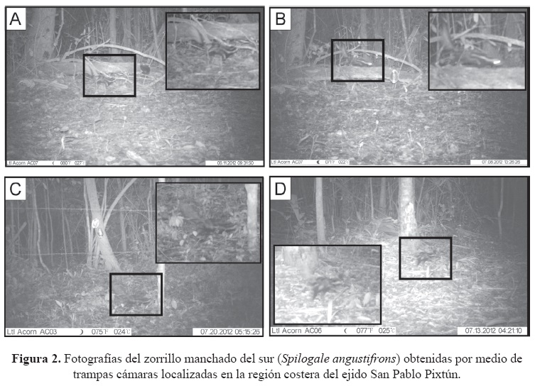 Las cuatro fotografías de zorrillos manchados del sur fueron obtenidas en tres diferentes cámaras localizadas a lo largo del área de estudio. Todas las observaciones corresponden a una región en la que la especie no había sido previamente registrada. Los primeros registros de zorrillo manchado del sur se obtuvieron en una cámara localizada en una brecha cortafuego ubicada al interior de una selva mediana sub-perennifolia de Pukté. (UTM 15, 725679, 2118343). En esta cámara se obtuvieron dos fotografías de individuos solitarios. La primera fotografía fue obtenida el 11 de Junio de 2012 (Fig. 2A) y la segunda el 8 de Julio (Fig. 2B). Debido a un problema de configuración de las cámaras, no es posible determinar la hora correcta de estos dos registros. El tercer registro de zorrillo se obtuvo el día 13 de Julio de 2012 a las 04:21 h en una cámara localizada al interior de selva mediana subperennifolia de Pukté (Fig. 2 C; UTM 15, 726911, 2119390). Esta cámara se encontraba a 2 km al oeste de la cámara donde se observaron los dos registros de zorrillo. El cuarto y último registro, se obtuvo el 20 de Julio de 2012 a las 05:15 h, en una cámara colocada en un área de acahuales localizada a 10 km al sur de los otros dos registros (Fig. 2 D; UTM 15, 733576, 2117410).
