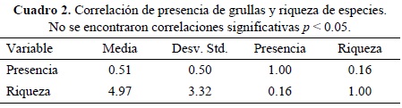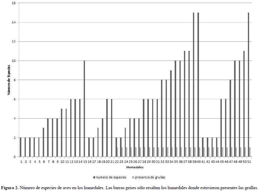Se observó una asociación en la riqueza de especies entre los humedales con presencia de grulla, ya que algunas especies sólo están presentes cuando están las grullas. Lo anterior puede deberse a una regla de asociación (ansembly rules) si consideramos cada humedal como una isla en la que los recursos son limitados, lo que excluye ciertas especies que compiten por los mismos recursos, mientras que para otras se pueden asociar debido a que hay menor presión entre las mismas, aunque la forma de toma de datos no permiten asegurarlo (Connor & Simberloff 1979, Gotteli & McCabe 2002).