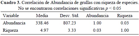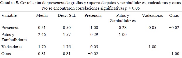 El número de especies puede reflejar el estado del humedal en cuanto a la disponibilidad de alimento y agua, así como su estructura si encontramos varios gremios dentro del mismo. Aunque no medimos en este estudio estos parámetros del humedal, las especies que encontramos pueden ser un reflejo de esta condición (Bayard & Elphik 2010). Guadagnin et al. (2005) ha reportado que los humedales aislados y fragmentados tienen una correlación negativa con la riqueza de especies y su abundancia. La variación en el número de especies entre los sitios con grullas y sin grullas puede estar relacionada con los patrones migratorios y las temporadas cuando se realizan los muestreos que hace que fluctué el número de especies registradas en el humedal. Pero no debemos descartar que las aves sirvan para evaluar el estado de salud de los ecosistemas basados en aspectos sociales (interacción intraespecíficas) y en la presencia de otras especies o grupos de aves (interacciones interespecíficas) (Reed & Dobson 1993, Danchin & Warner 1997, Bayard & Elphik 2010). Guadagnin et al. (2005) encontraron que en sitios fragmentados las especies ausentes son aquellas con mayor masa corporal, principalmente los anátidos y especies raras como las garzas que en este estudio no se encontraban en los humedales. Aunque no estudiamos el efecto de la fragmentación y aislamiento de los humedales, se encontró que en aquellos humedales donde estuvieron presentes las grullas también mostraron una mayor presencia de anátidos y garzas, lo que puede indicar que los humedales donde se presentan las grullas pueden tener un mejor estado de conservación o de salud, lo cual puede ser evaluado usando el número de individuos y las especies a través de la presencia y abundancia de otras especies de aves acuáticas. Aunque en este estudio no se analizaron estas posibilidades y se encontró poca correlación entre las mismas.