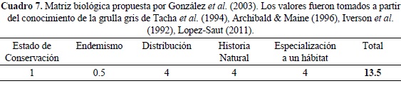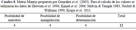 En cuanto a la evaluación como bioindicador, se sumaron los valores de cada una de las matrices, siendo el total de la matriz de biología de 15.5 (valor máximo es 20) y para la matriz de manejo el valor obtenido fue de 12 (valor máximo es 12). Las suma de los dos valores da un total de 27.5 de un valor de 32, que es el valor máximo para una especie bioindicadora propuesta por González et al. 2003 (Cuadros 6 y 7).