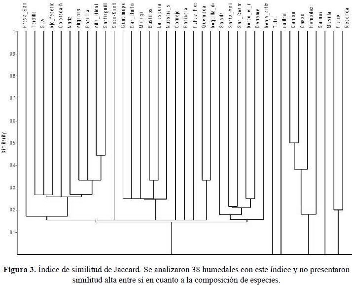 donde a es el número de las especies en el humedal a, b es el número de especies en el humedal b y c el número de especies que comparten los humedales. El análisis se hizo usando el programa PAST.