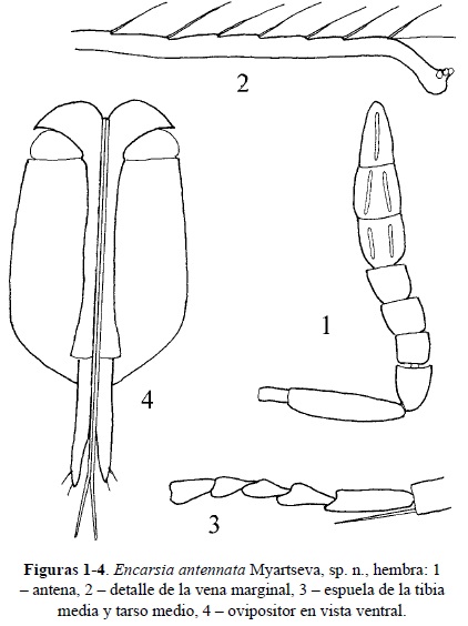 Encarsia antennata Myartseva, sp. n. (Figs. 1-4)