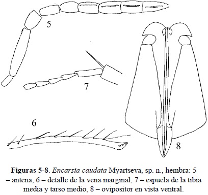Encarsia caudata Myartseva, sp. n.(Figs. 5-8)