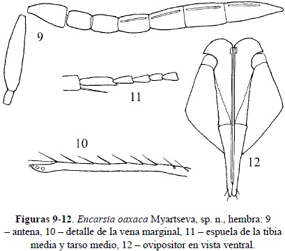 Comentarios taxonómicos. Encarsia oaxaca n. sp. es cercana a E. juanae Myartseva & Evans, descrita del Estado de Tamaulipas y obtenida de Diaspididae; se distinguen por las características siguientes: en E. oaxaca los segmentos funiculares son más largos, 1.3, 1.5 y 1.6x tan largos como anchos, respectivamente, y la maza antenal visiblemente más larga que el funículo y el pedicelo juntos, ovipositor tan largo como la tibia media, válvula III ligeramente más corta que el valvífer II, mesosoma pardo y la mitad basal del gáster es amarilla. En E. juanae los segmentos funiculares son más cortos, 1.1, 1,1 y 1.2x tan largos como anchos, respectivamente, y la maza antenal subigual o más corta que el funículo y el pedicelo juntos, ovipositor ligeramente más corto que la tibia media, válvula III es 0.48x tan larga como el valvífer II, mesosoma amarillo con un área triangular central parduzca y la mitad basal del gáster es parda. El holotipo de E. juanae se ha estudiado, está depositado en el MIFA-UAT.