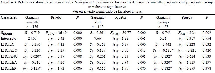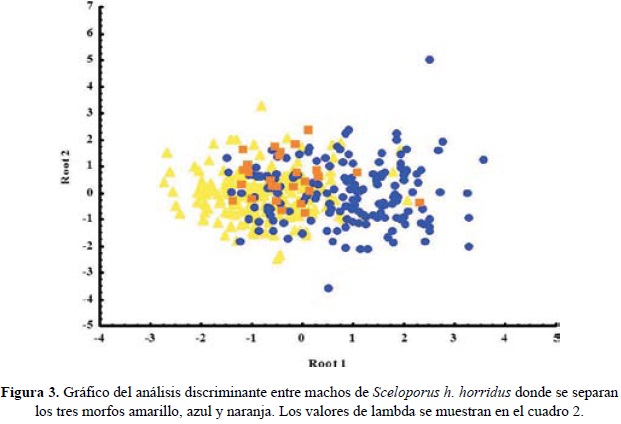 También existen parches de color en las escamas de la región ventral, la región dorso lateral del cuerpo y en el dorso de las extremidades anteriores y posteriores. De acuerdo con el ANDEVA y la prueba de Duncan, los morfos son reconocibles entre sí por variaciones significativas en los siguientes caracteres: longitud hocico-cloaca; largo, ancho y alto de la cabeza; y longitud de las extremidades anteriores y posteriores (Cuadro 1). Los machos del morfo azul son los más grandes de los tres, por tener la mayor longitud hocico-cloaca (LHC 91.97 mm ± 10.18, n = 161), lo mismo que la longitud de la cabeza (LC 24.30 mm ± 2.71, n = 161), la altura de la cabeza (ALC 14.96 ± 2.48, n = 161) y las extremidades anteriores (LEA 34.57 mm ± 4.40, n = 161) y posteriores (LEP 50.79 mm ± 6.30, n = 161). Después se encuentran los machos del morfo naranja (LHC 83.54 ± 7.82, n = 26); y los del morfo amarillo (LHC 81.93 ± 7.45, n = 176), que tuvieron las medidas del cuerpo más pequeñas (Cuadro 1).