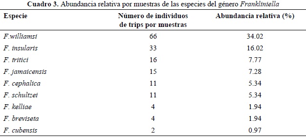 Con relación a la incidencia de los trips sobre las diferentes especies botánicas, F. williamsi fue la de mayor valor, la que se asoció a 18 especies de plantas, le siguió en orden F. tritici. F. insularis y F. jamaicensis se asociaron a seis y cinco especies botánicas (Cuadro 2).
