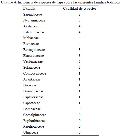 Al analizar la incidencia de las diferentes especies de trips sobre las diversas familias botánica se puede observar (Cuadro 4) que la misma manifestó un valor elevado. Las familias con mayor incidencia de trips fueron Sapindaceae, Nyctaginaceae, Araliaceae, Esterculiaceae, Meliaceae y Rubiaceae, mientras que Borraginaceae y Flacurciaceae mostraron un valor menor. Las familias Acantaceae, Bixaceae, Bromeliaceae, Papaveraceae y Sapotaceae exhibieron la menor incidencia de especies de trips con solo una en cada una. Es de destacar que sobre las familias Bombacaceae, Caesalpinaceae, Euphorbiaceae, Papilionaceae y Ulmaceae no se detectaron trips.