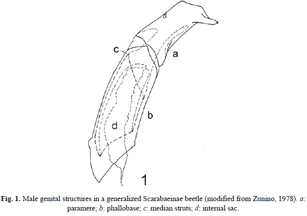 Male, and less frequently female, genitalia characters have often been utilized in beetles taxonomic and phylogenetic research, since as early as the beginning of the 20th century, starting at least from the seminal books by Sharp and Muir (1912), and subsequently by Jeannel (1955), where the genital anatomy of Coleoptera was first systematized (for some historical remarks mostly concerning Scarab beetles see Zunino 2012). The prevailing importance of genitalia not just in alpha taxonomy, but as reliable phylogenetic tracers against external morphological characters underlies a great amount of papers throughout at least fifty years; it was explicitly stressed by Zunino (1983, 1987), Zunino & Palestrini (1988), and was formally demonstrated by Tarasov & Solodovnikov (2011) by means of a cladistic analysis of a large sample of Onthophagini. Medina et al. (2013) emphasize the importance of recognizing the homologies within different male genital structures in the frame of Scarabaeinae, and of unifying the relative nomenclature, for several scientific purposes. The authors thank me for "... read[ing] the manuscript and [giving] us important suggestions" (ibid: 474); however, as my former main criticisms to their manuscript (Zunino to Medina and Molano, personal communication, 14/03/2011) were entirely overlooked, even having in mind the ethical principle of the absolute freedom of scientific research, I would like to make the following brief remarks.
