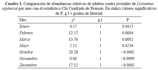 Los adultos fueron más abundantes que los juveniles en los meses de enero, febrero, marzo y diciembre, mientras que los juveniles lo fueron desde mayo a octubre, y en noviembre se encontraron abundancias similares (Cuadro 1). Cuando se comparan las abundancias de los adultos y los juveniles por estación, se encuentran diferencias significativas en verano, otoño y primavera, con adultos más abundantes en primavera (x2 = 8.45; g.l. = 1; P = 0.0037) y verano (x2=14.47; g.l. = 1; P = 0.0001) y juveniles más abundantes en otoño (x2 = 10.67; g.l. = 1; P = 0.0011).