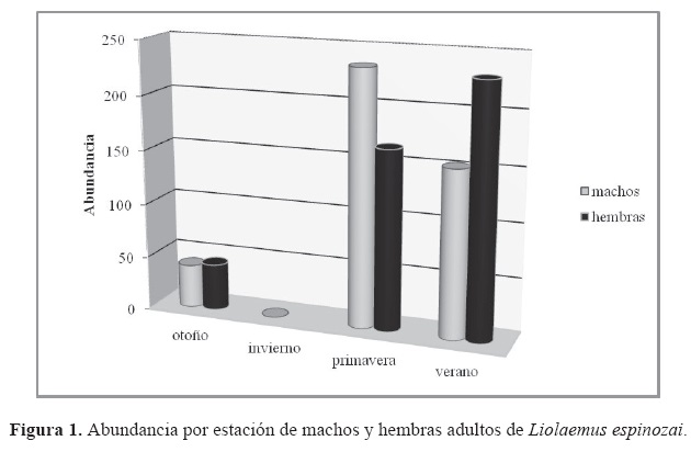 Las hembras adultas fueron más abundantes que los machos en febrero (X2 = 6.05, g.l. = 1; P = 0.0139) y marzo (X2 = 5.23, g.l. = 1; P = 0.0223), y los machos fueron más abundantes que las hembras en noviembre (X2 = 8.67, g.l. = 1; P = 0.0032). A su vez, los machos fueron más abundantes en la época reproductiva (octubre, noviembre y diciembre) y las hembras más abundantes en la post-reproductiva (enero, febrero y marzo) (Mann-Whitney: U = 62121; P < 0,0000; n = 395 machos y n = 387 hembras) (Fig. 1).