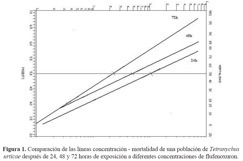 Estos resultados indican que aunque el producto está catalogado como un regulador de crecimiento que entra en el cuerpo del ácaro por contacto o ingestión e inhibe la síntesis de quitina, también las hembras adultas de T. urticae presentan mortalidad por la presencia del acaricida. Como se puede observar la mortalidad aumenta 2.13 y 4.44 veces a las 48 y 72 horas en relación a la CL50 obtenida para las 24 horas. Young et al. (1993) no observaron mortalidad en hembras adultas de T. urticae con la aplicación de flufenoxuron a una concentración de 0.25 mg/planta; aunque pudiera mencionarse que esta concentración transformada en partes por millón es mucho menor a las utilizadas en esta investigación.