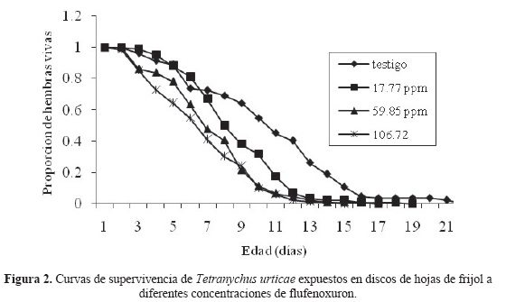 Para desarrollar lo anterior, las hembras que sobrevivieron después de 72 horas de exposición al último juego de bioensayos que se utilizó para determinar la CL50, se trasladaron y mantuvieron por 24 horas en discos de hoja libres de flufenoxuron. Una vez que las hembras ovipositaron se les removió del disco y se conservaron únicamente los huevos para que éstos se desarrollaran. En el momento en que éstos se transformaron en adultos, se seleccionaron 90 parejas de cada una de las concentraciones probadas. Los huevos producidos por cada pareja se colocaron separadamente en discos de hojas tratadas. Conforme eclosionaban los huevos las larvas se removía y colocaban en nuevos discos hasta que llegaban al estado adulto. Las observaciones se hicieron hasta la muerte de la última hembra. Con los datos obtenidos se calcularon los parámetros de vida consignados por Birch (1948); es necesario mencionar que en todos los casos la población inicial de hembras madres se redujo, ya que algunas de ellas desaparecieron durante la fase del experimento, retirándose del registro los datos de la progenie provenientes de ellas. Las curvas de supervivencia se compararon sobre la base de la prueba de Log-rank (Méndez et al. 1984). A su vez se realizó un análisis de varianza completamente al azar para determinar diferencias entre los tratamientos y el testigo en relación a la fecundidad de las hembras.